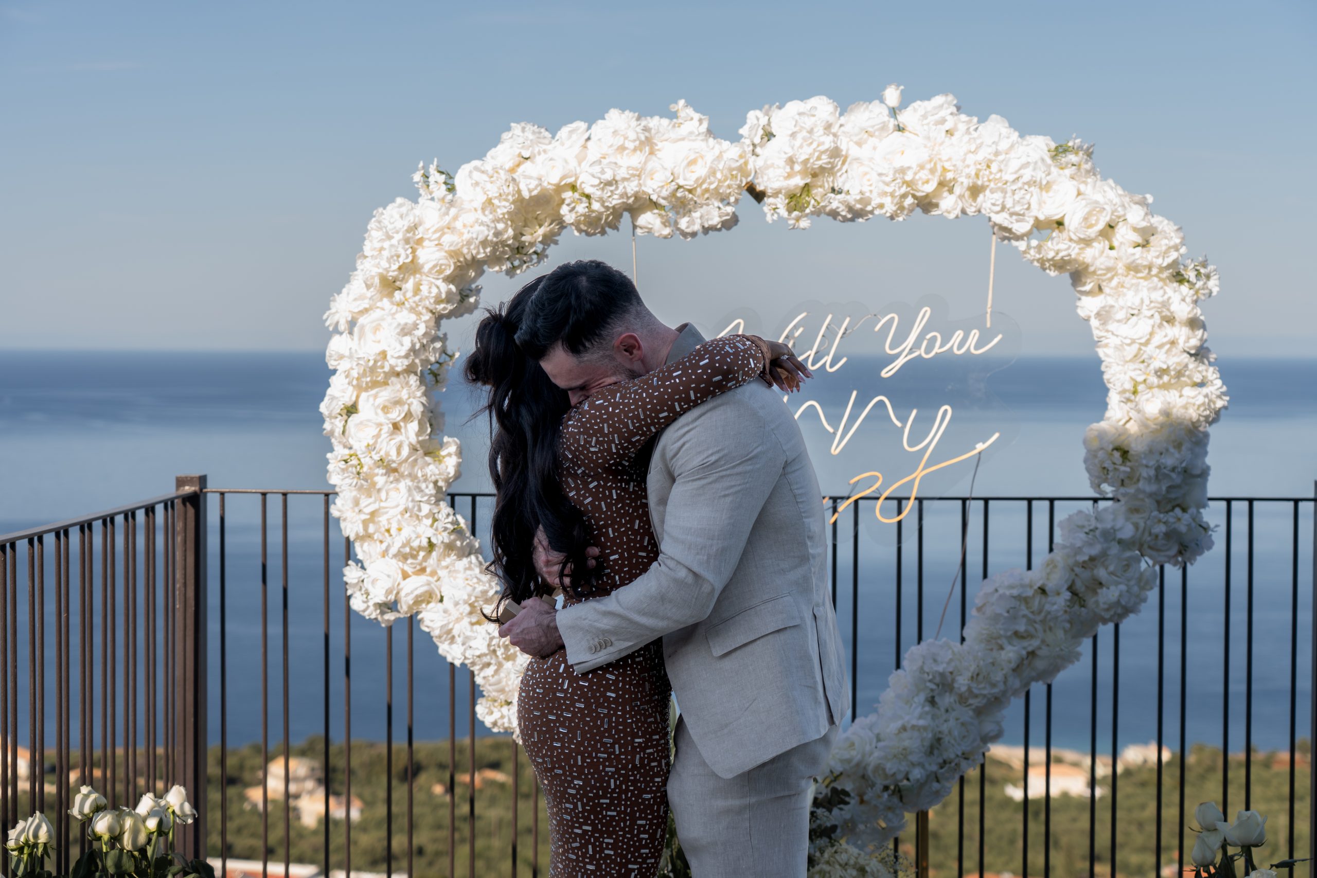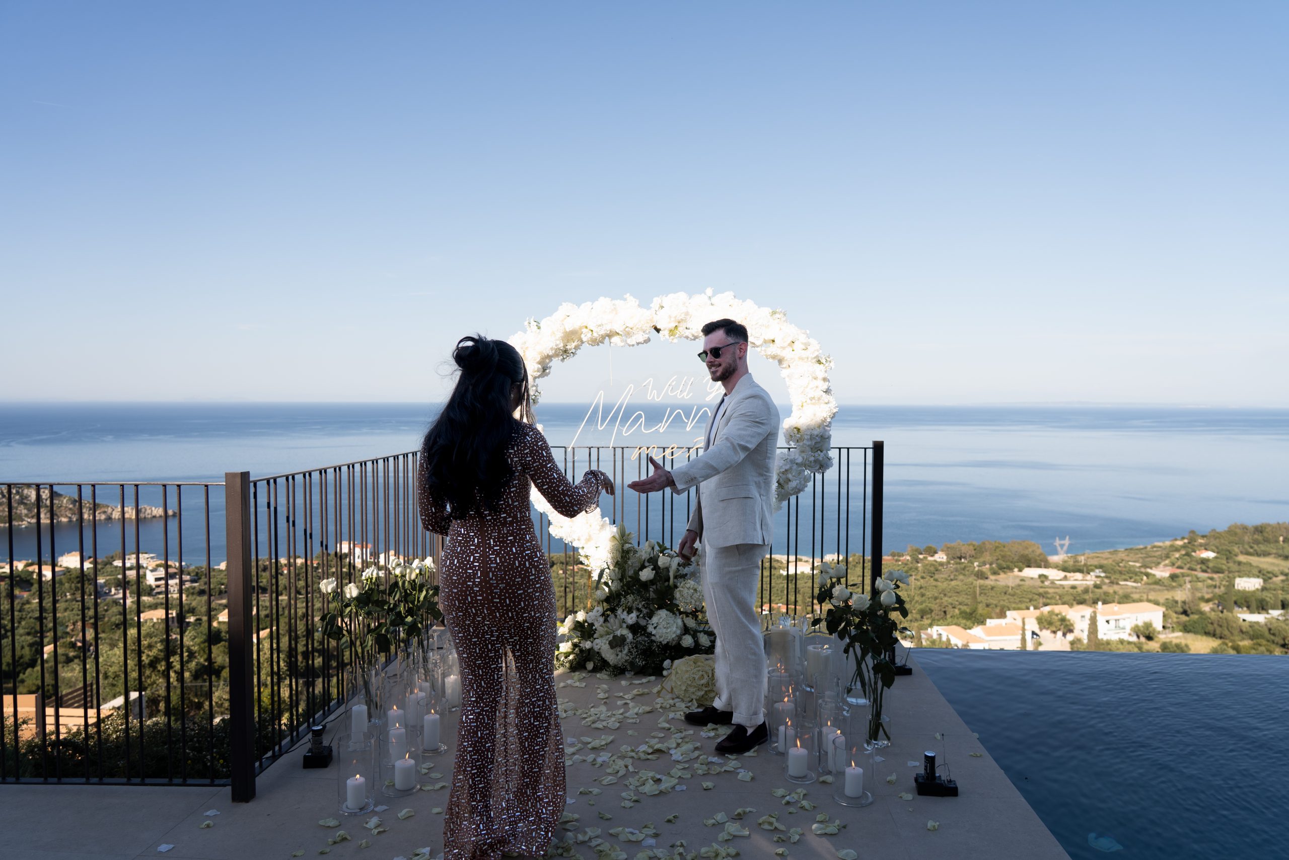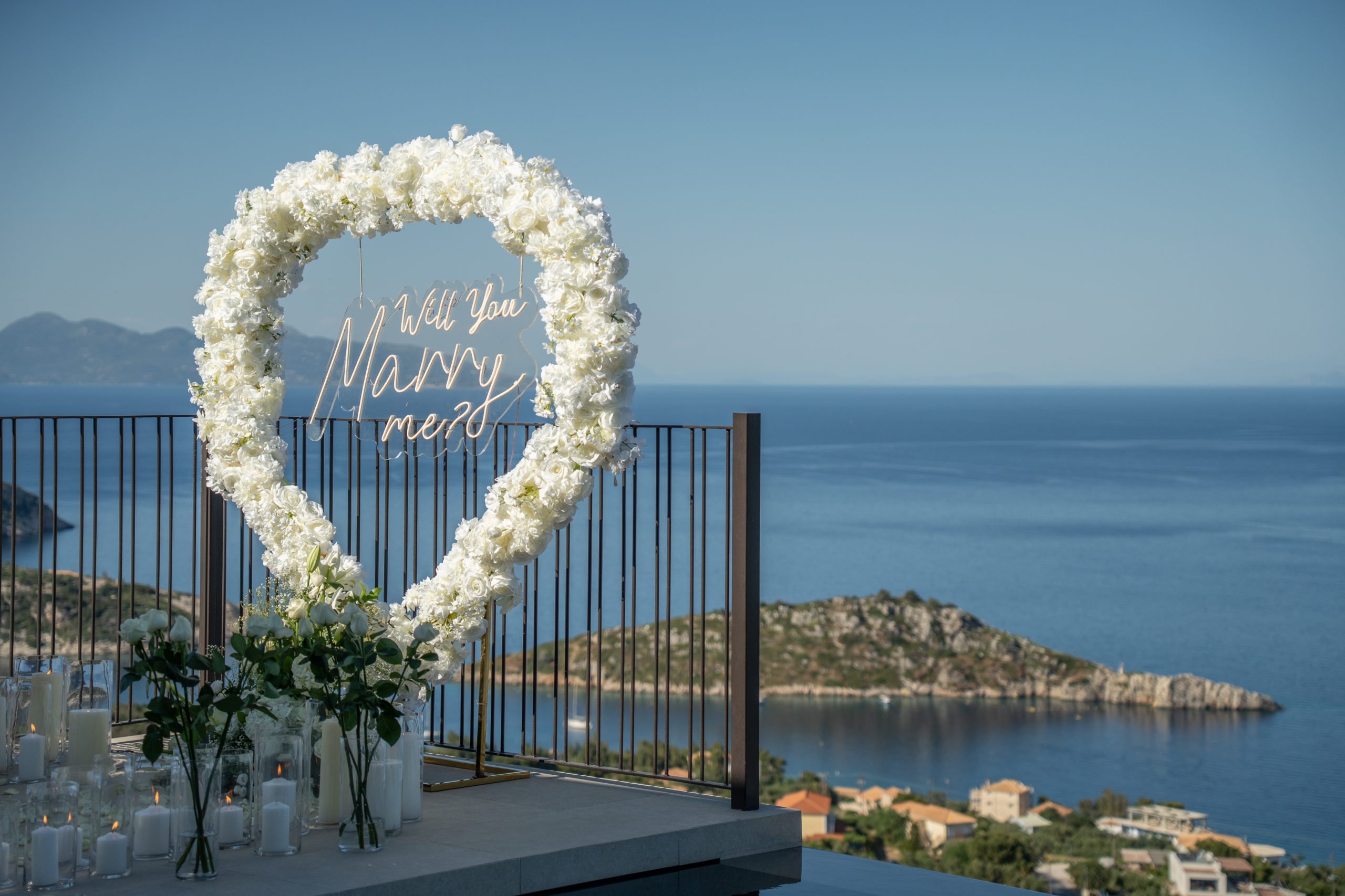 A breathtaking proposal overlooking the sea, surrounded by white roses, candles, and a glowing “Will you marry me?” sign.