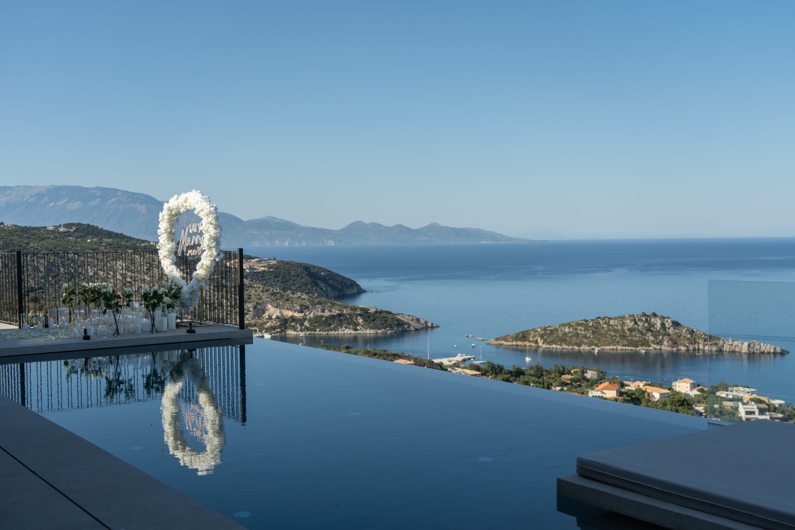 Our team curated every detail — from the floral arch to the rose petals and fireworks — creating the perfect setup on a private balcony with stunning views of the Ionian Sea.